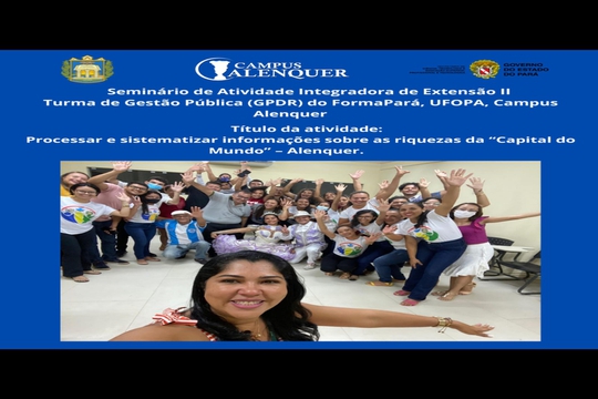 No dia 19/08/2022 aconteceu o seminário de Atividade Integradora de Extensão II, com a turma de Gestão Pública (GPDR) do FormaPará, UFOPA, Campus Alenquer, tendo como título da atividade: Processar e sistematizar informações sobre as riquezas da “Capital do Mundo” – Alenquer. Os discentes da turma com muito empenho e dedicação produziram vídeos excelentes abordando os eixos temáticos empreendedorismo, desenvolvimento econômico, cultura, turismo, bioeconomia e política pública no município de Alenquer. Essa atividade envolvia todas as disciplinas do segundo período e foi conduzida pela professora Dra. Giselle Alves que parabenizou a atividade.