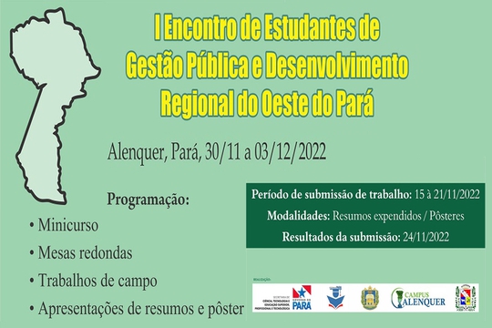 A coordenação do curso de Gestão Pública, ofertado pela Ufopa através do programa Forma Pará em Alenquer, promoverá o I Encontro de Estudantes de Gestão Pública e Desenvolvimento Regional do Oeste do Pará (I Egepa) no período de 30 de novembro a 3 de dezembro de 2022. O objetivo é promover o debate e a troca de experiências sobre o exercício da Gestão Pública no Oeste do Pará. O evento será realizado no auditório do campus da Ufopa em Alenquer.