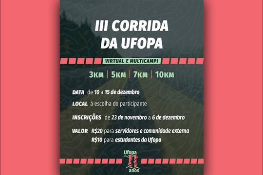 Em 2020, a III Corrida da Ufopa acontece no mês de dezembro, com algumas novidades. Para cumprir as medidas de distanciamento social, o evento será realizado de forma virtual e multicampi. As inscrições começam no dia 23 de novembro e vão até 6 de dezembro nos municípios de Santarém, Alenquer, Monte Alegre, Itaituba, Juruti, Óbidos e Oriximiná.