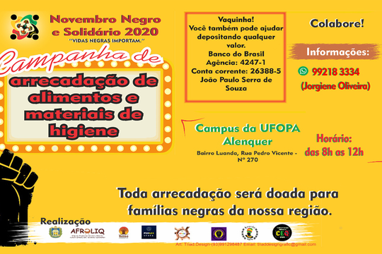 A Universidade Federal do Oeste do Pará, ao longo dos anos, realiza no mês de novembro a semana da consciência negra, que neste ano, em virtude da pandemia, acontece no formato de uma campanha solidária, que tem como objetivo arrecadar alimentos e material de higiene.